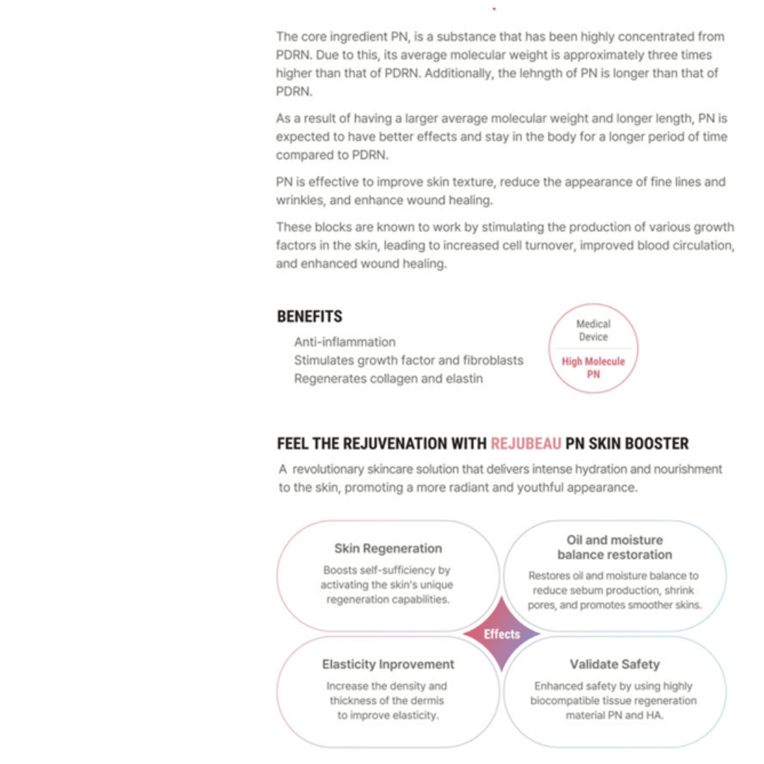 Purpose: Rejubeau PN Healer is expertly formulated to provide superior healing and revitalize the skin through its powerful polynucleotide component. This innovative treatment enhances your skin barrier, tightens pores, improves elasticity, and boosts collagen production, making it an essential solution for various skin concerns.